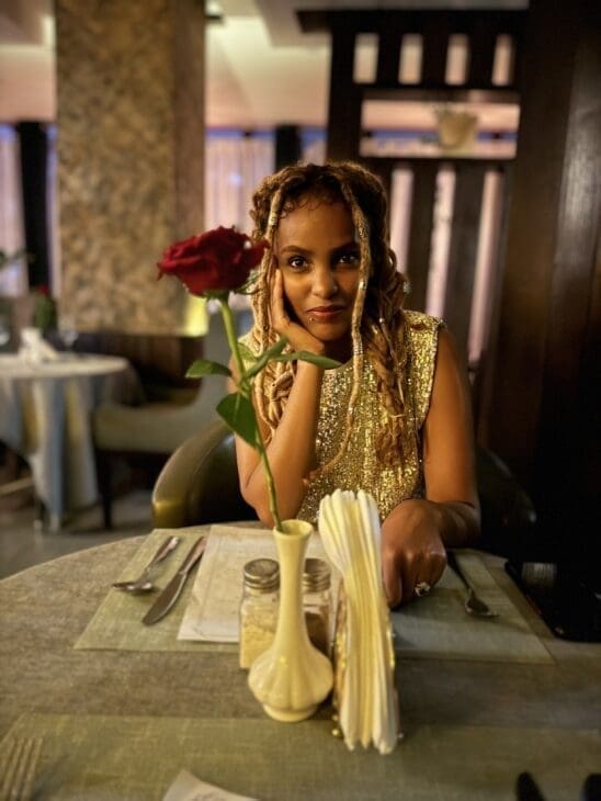 As we got ready for our night out, the excitement in the air was palpable. Misael looked absolutely stunning. Her dreadlocks were styled elegantly, and her chic outfit pulled everything together. She wore soft red lipstick that matched the vibrant rose at the center of our table. The combination gave the evening a romantic vibe. I felt truly honored to be with her as we set off for what promised to be an amazing culinary adventure.